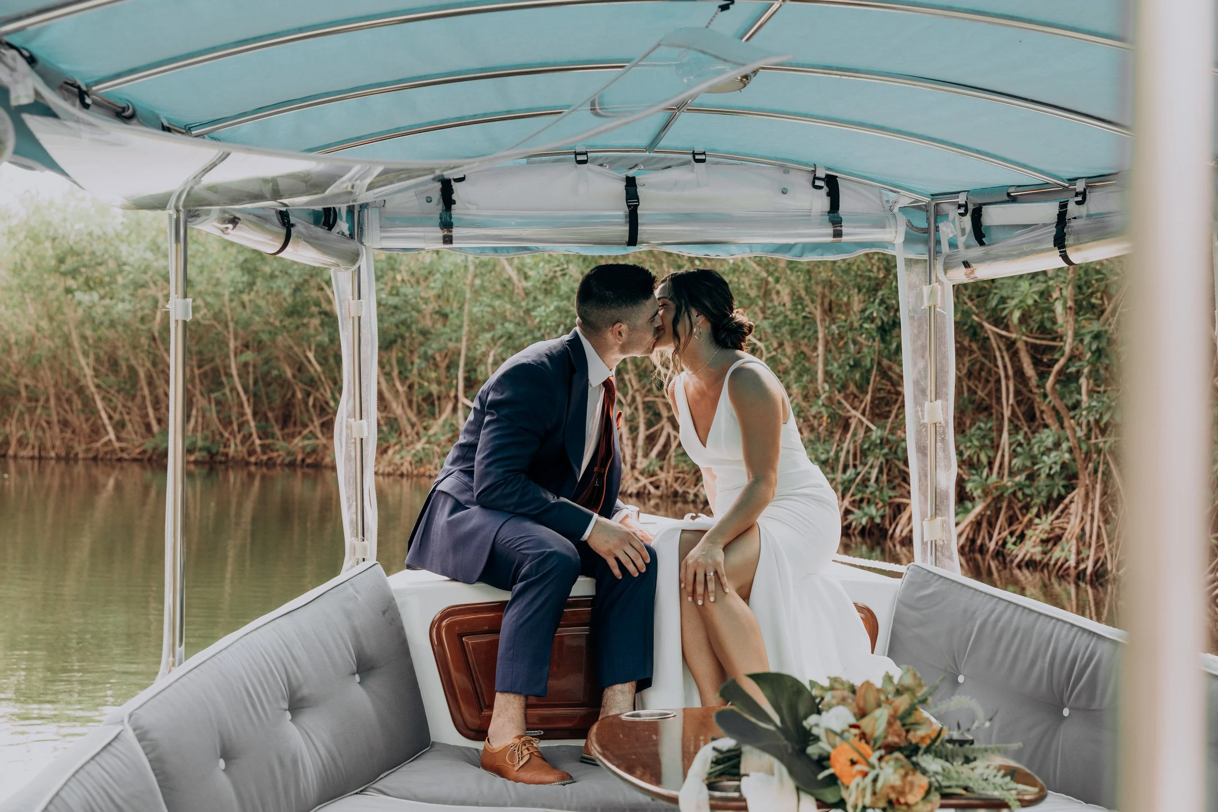 Lauren and Greyson’s wedding at Andaz Mayakoba was a beautiful blend of intimacy and natural beauty. They got ready in one of the resort’s stunning private villas, surrounded by lush greenery and the peaceful sounds of nature. When the moment arrived, they stepped onto a small boat that the hotel uses to ferry guests across the lagoon, where they exchanged heartfelt vows as the gentle water reflected the golden light of the afternoon.