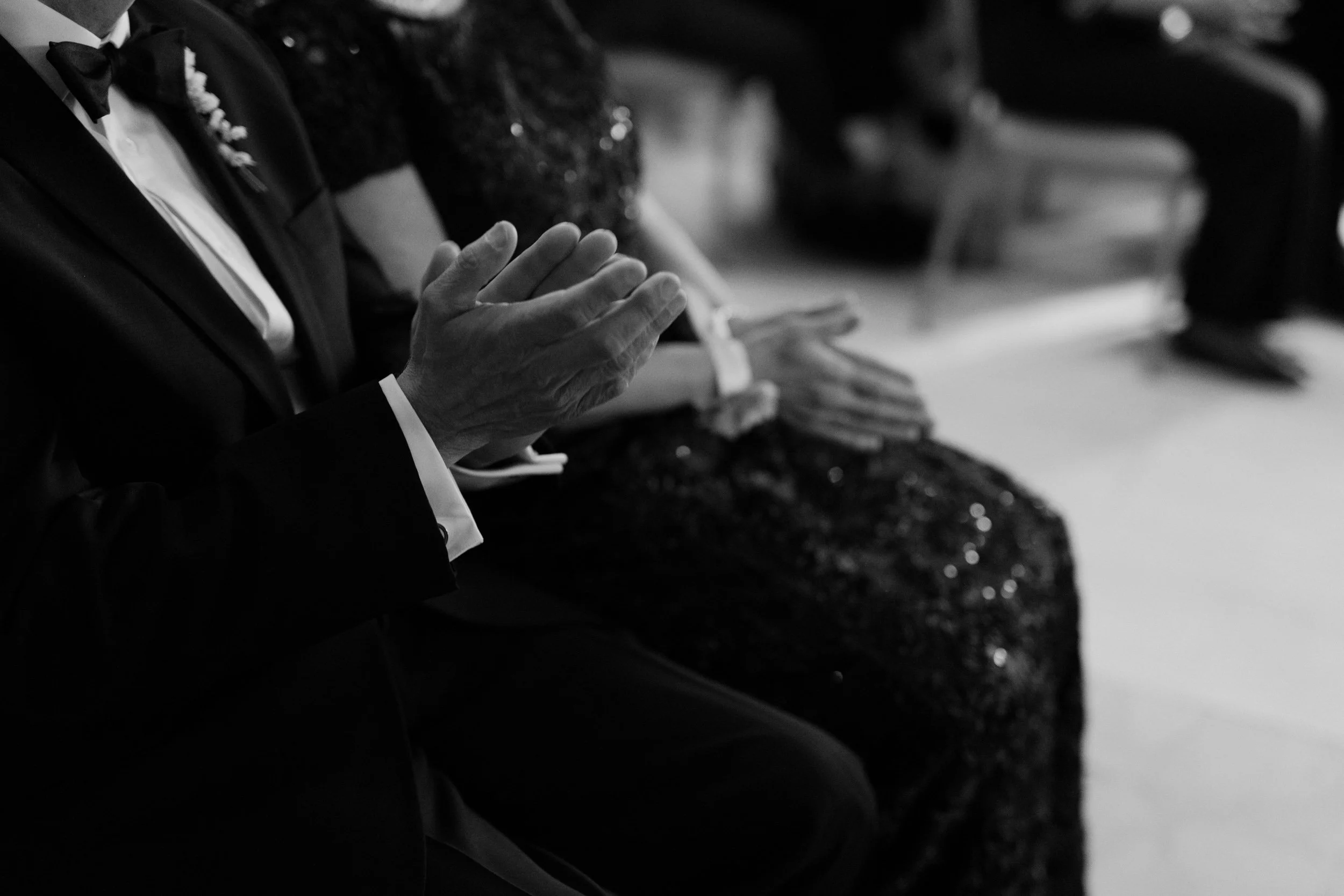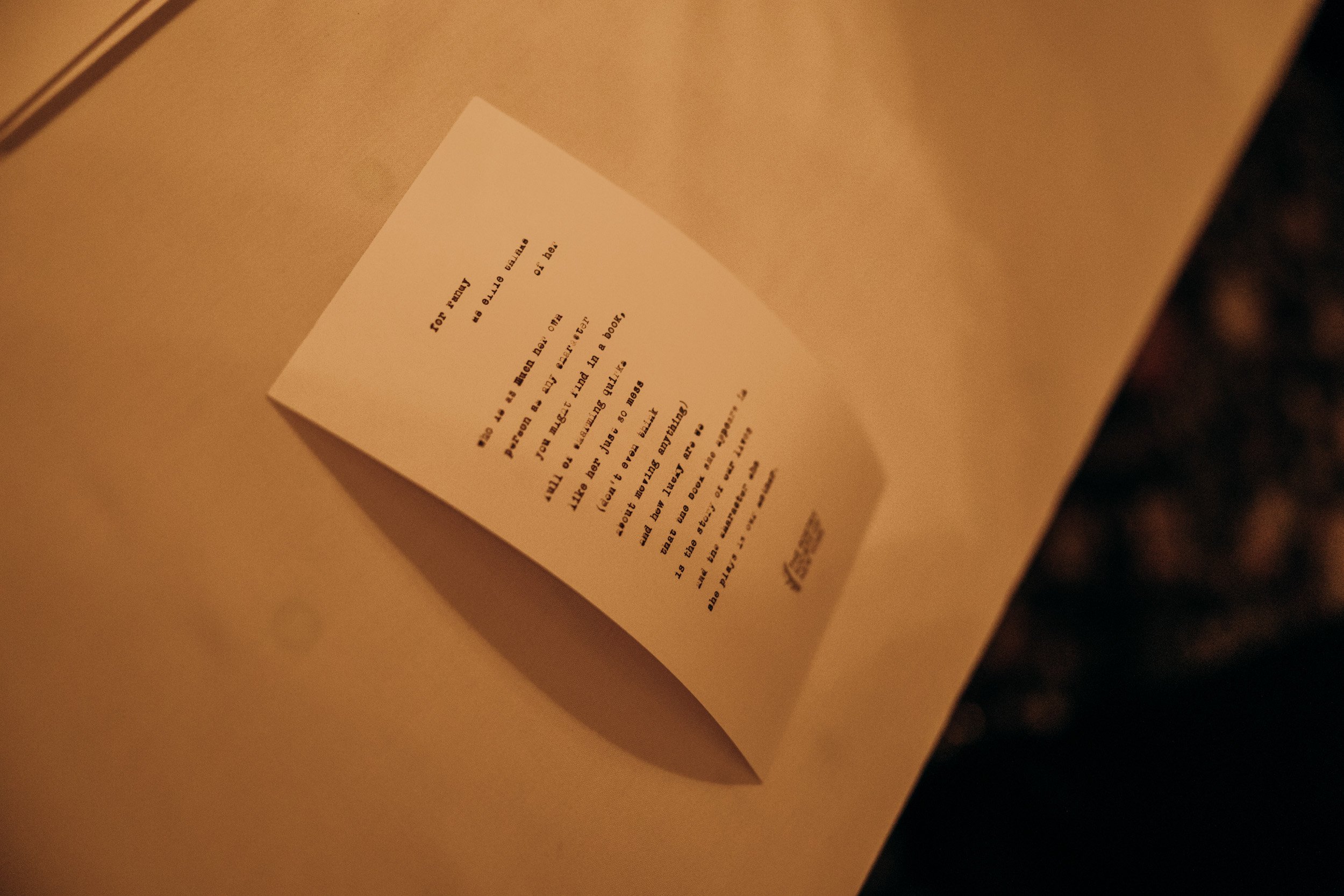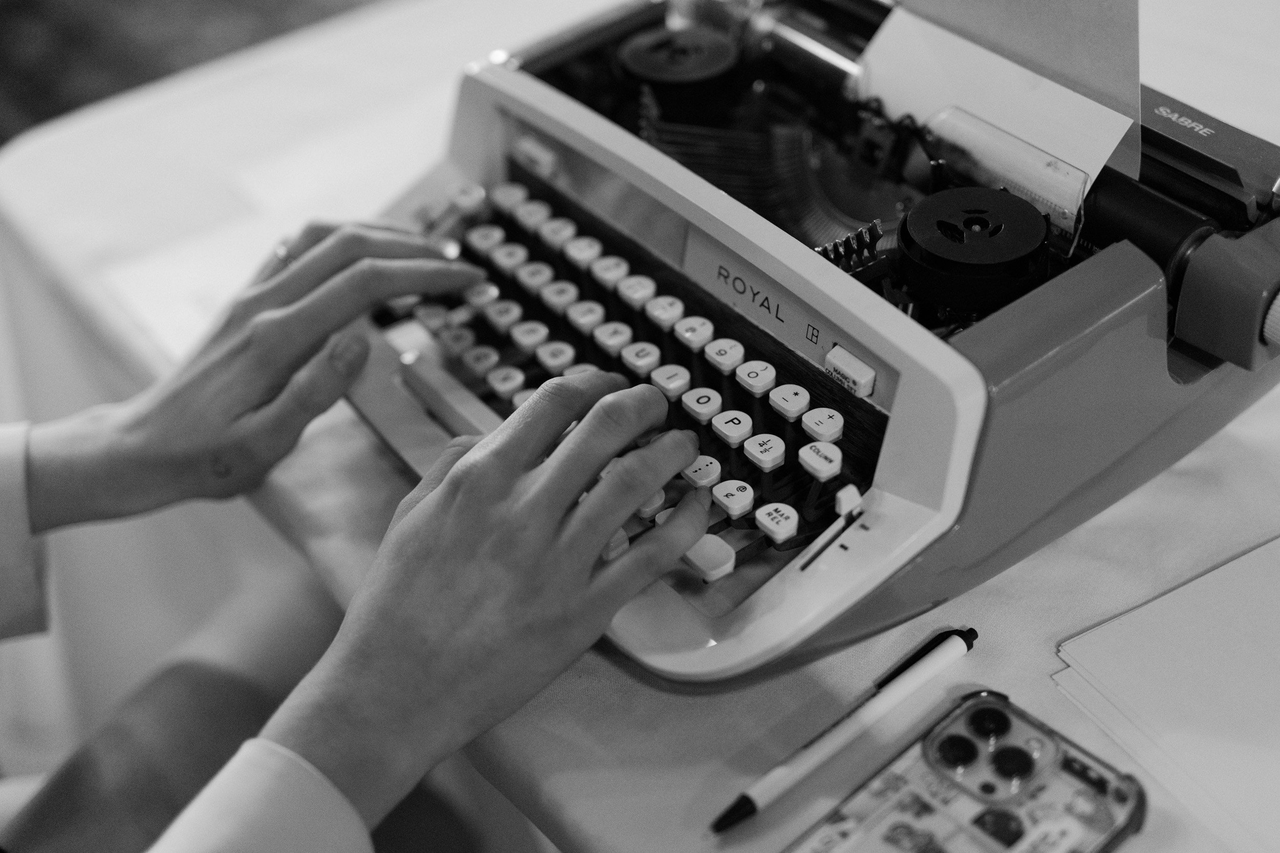 The celebration itself was filled with thoughtful, creative details. During cocktail hour, live poets sat behind vintage typewriters, inviting guests to share small personal details before improvising and typing custom poems on ink and paper. It was one of the most unique guest experiences we’ve witnessed — meaningful, interactive, and deeply memorable. As dinner began, a live jazz band transformed the ballroom. Every guest — young and old — filled the dance floor, moving effortlessly to the rhythm. The energy was joyful, stylish, and completely authentic to the couple.