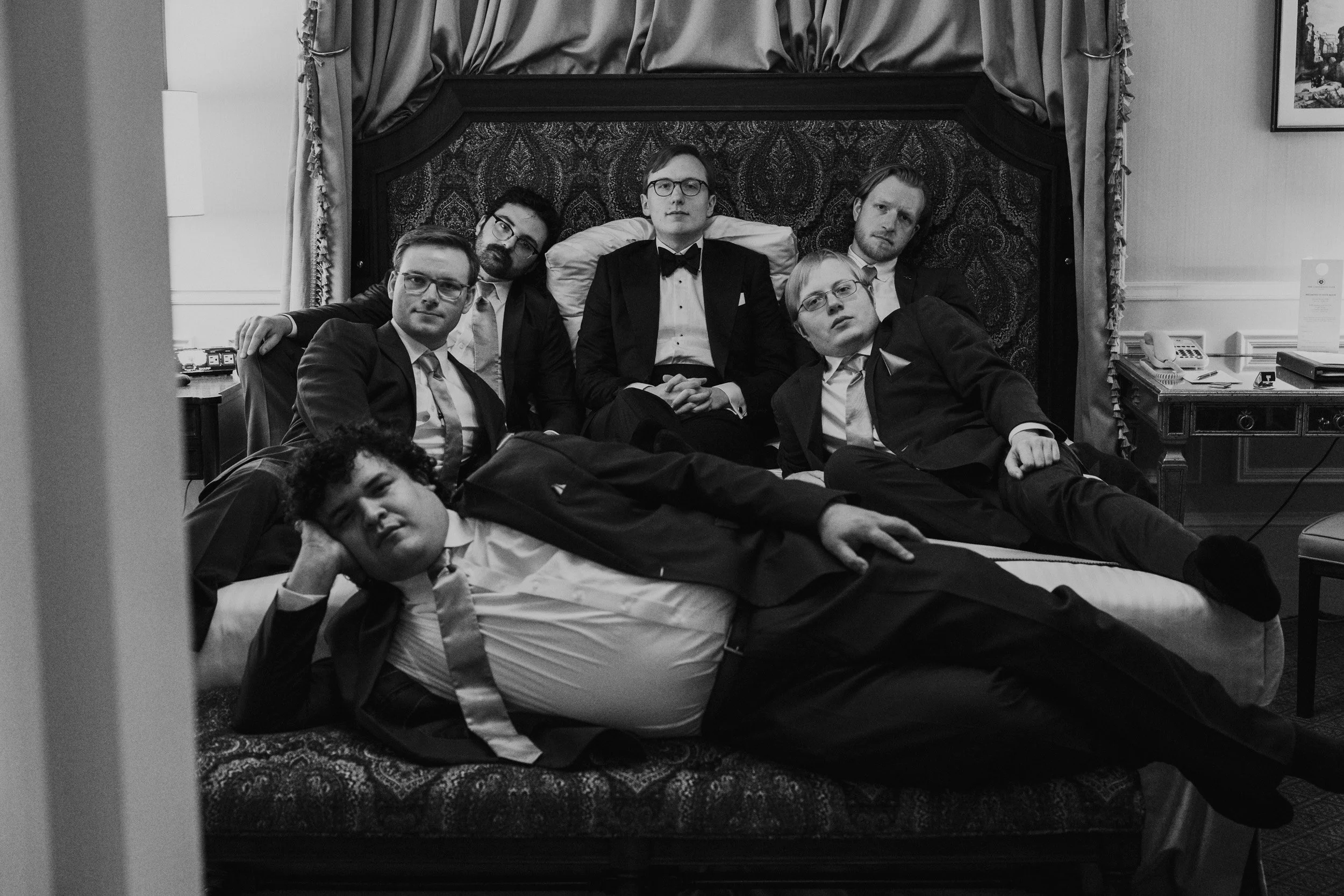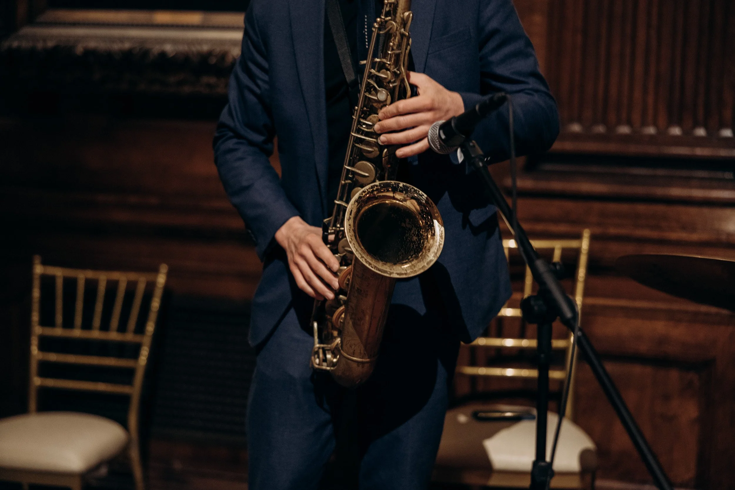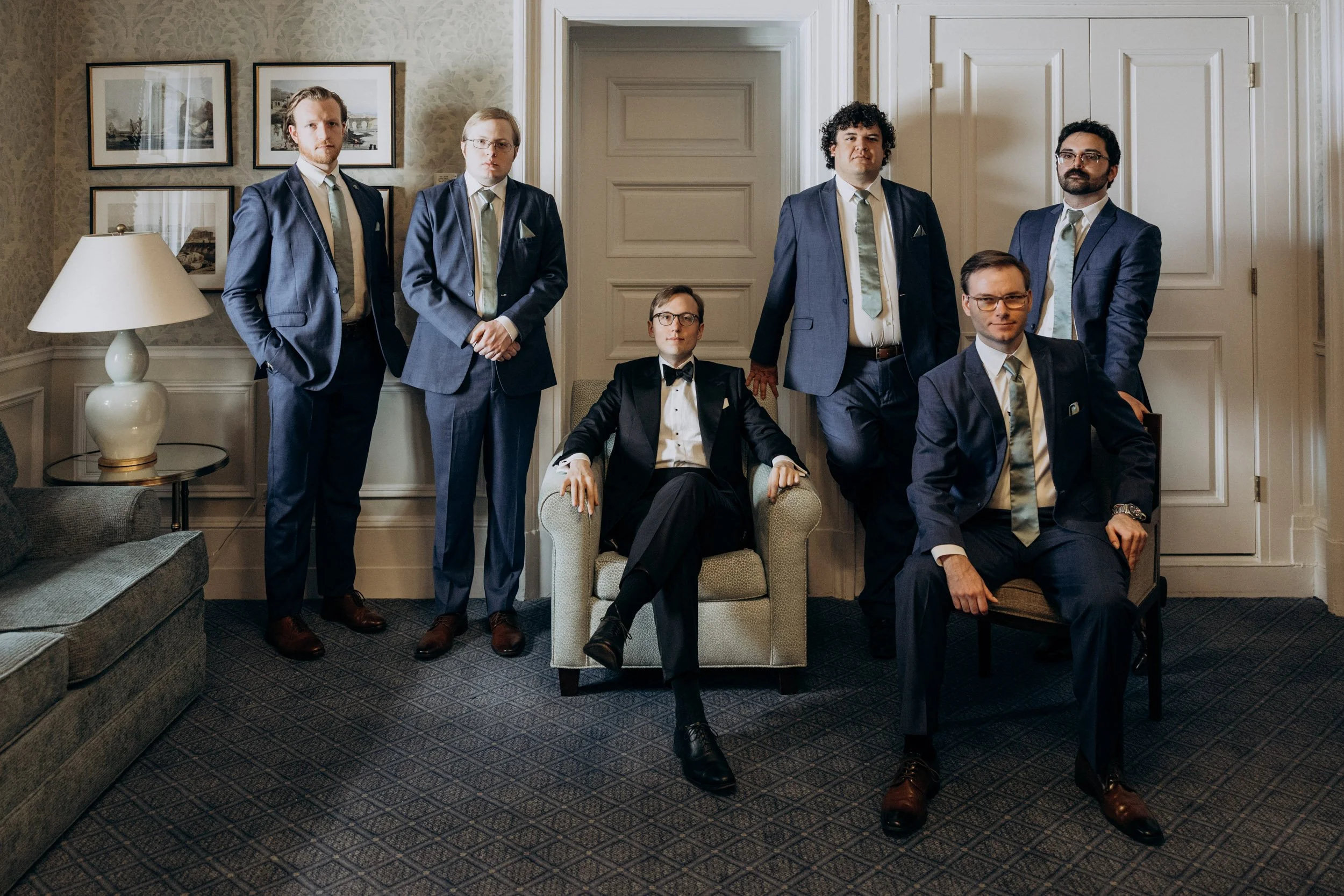 The celebration itself was filled with thoughtful, creative details. During cocktail hour, live poets sat behind vintage typewriters, inviting guests to share small personal details before improvising and typing custom poems on ink and paper. It was one of the most unique guest experiences we’ve witnessed — meaningful, interactive, and deeply memorable. As dinner began, a live jazz band transformed the ballroom. Every guest — young and old — filled the dance floor, moving effortlessly to the rhythm. The energy was joyful, stylish, and completely authentic to the couple.