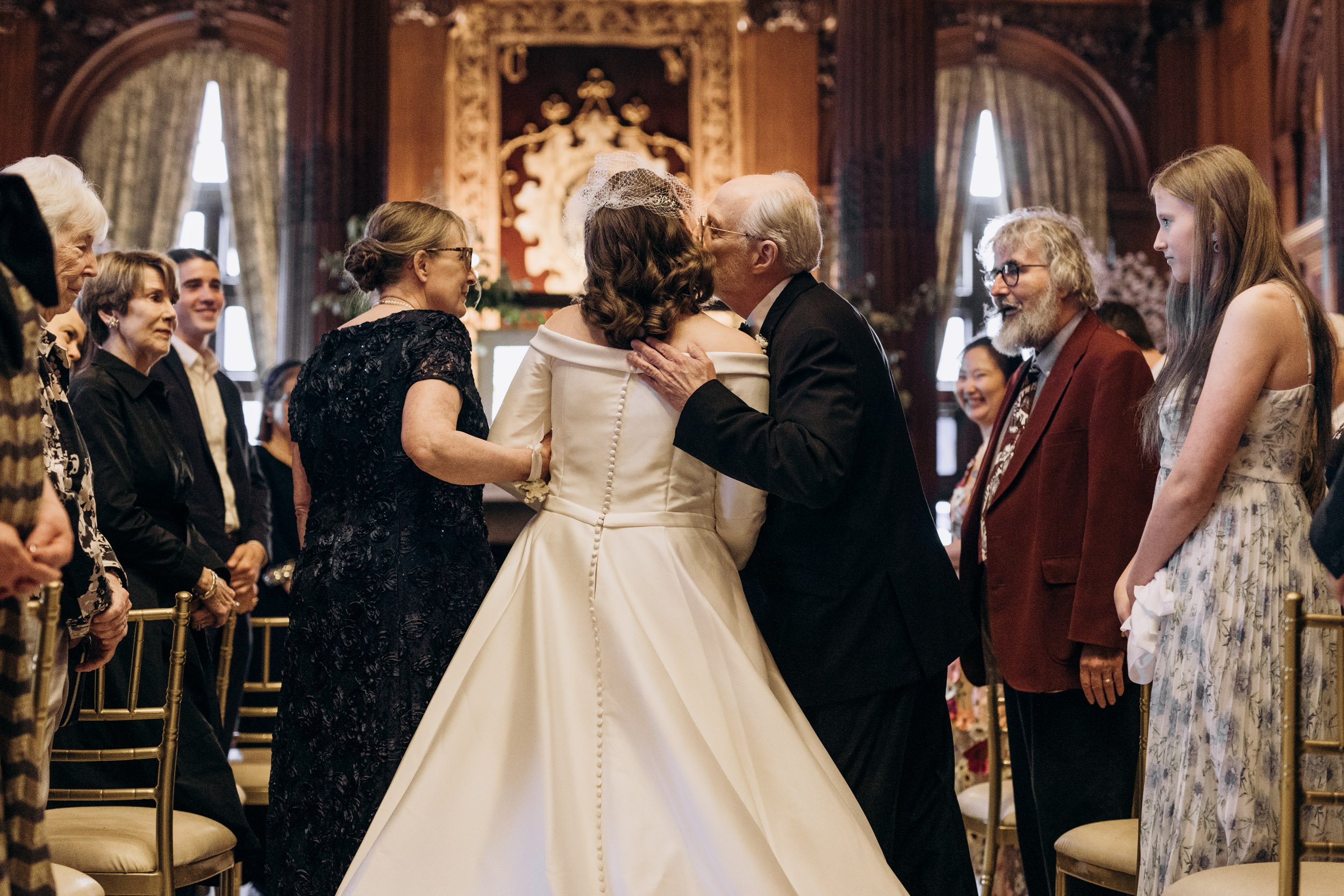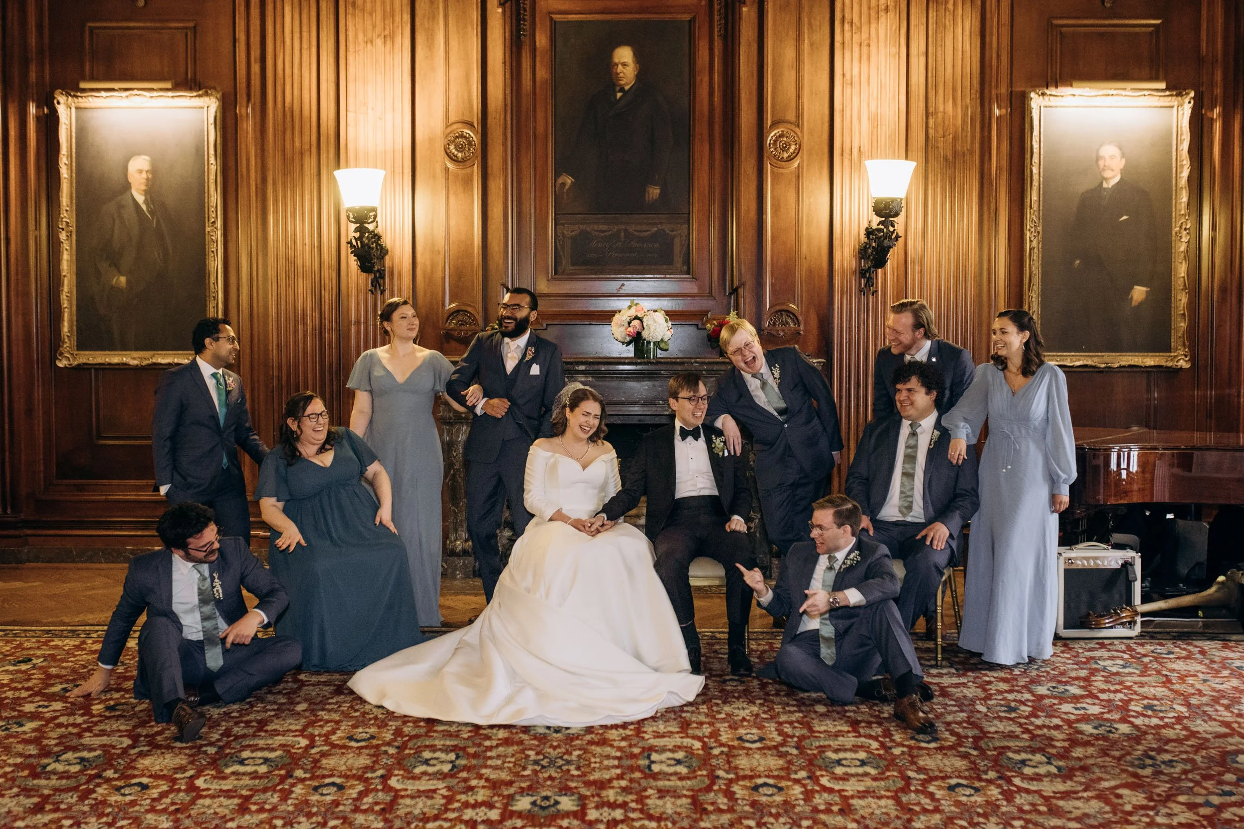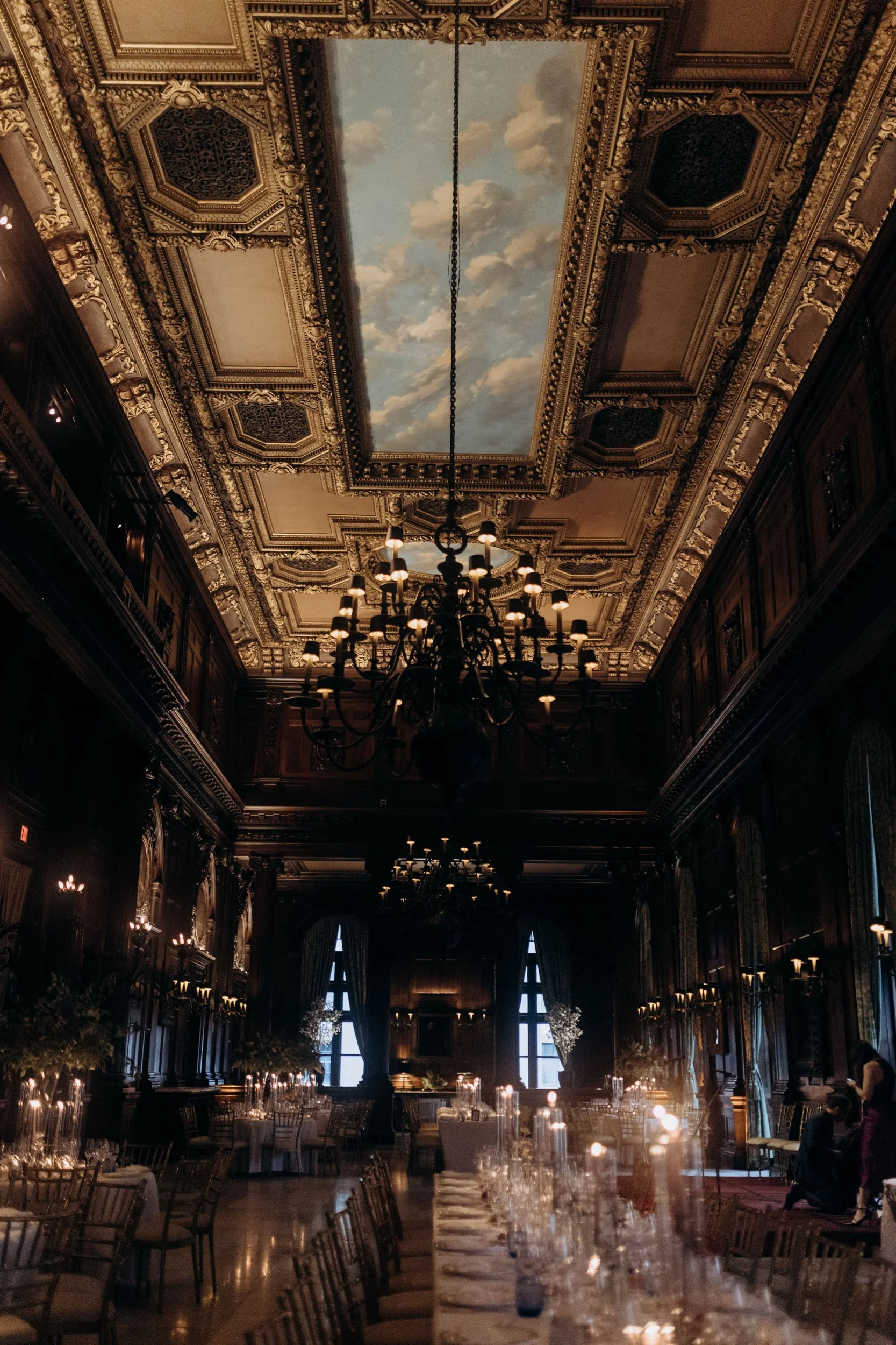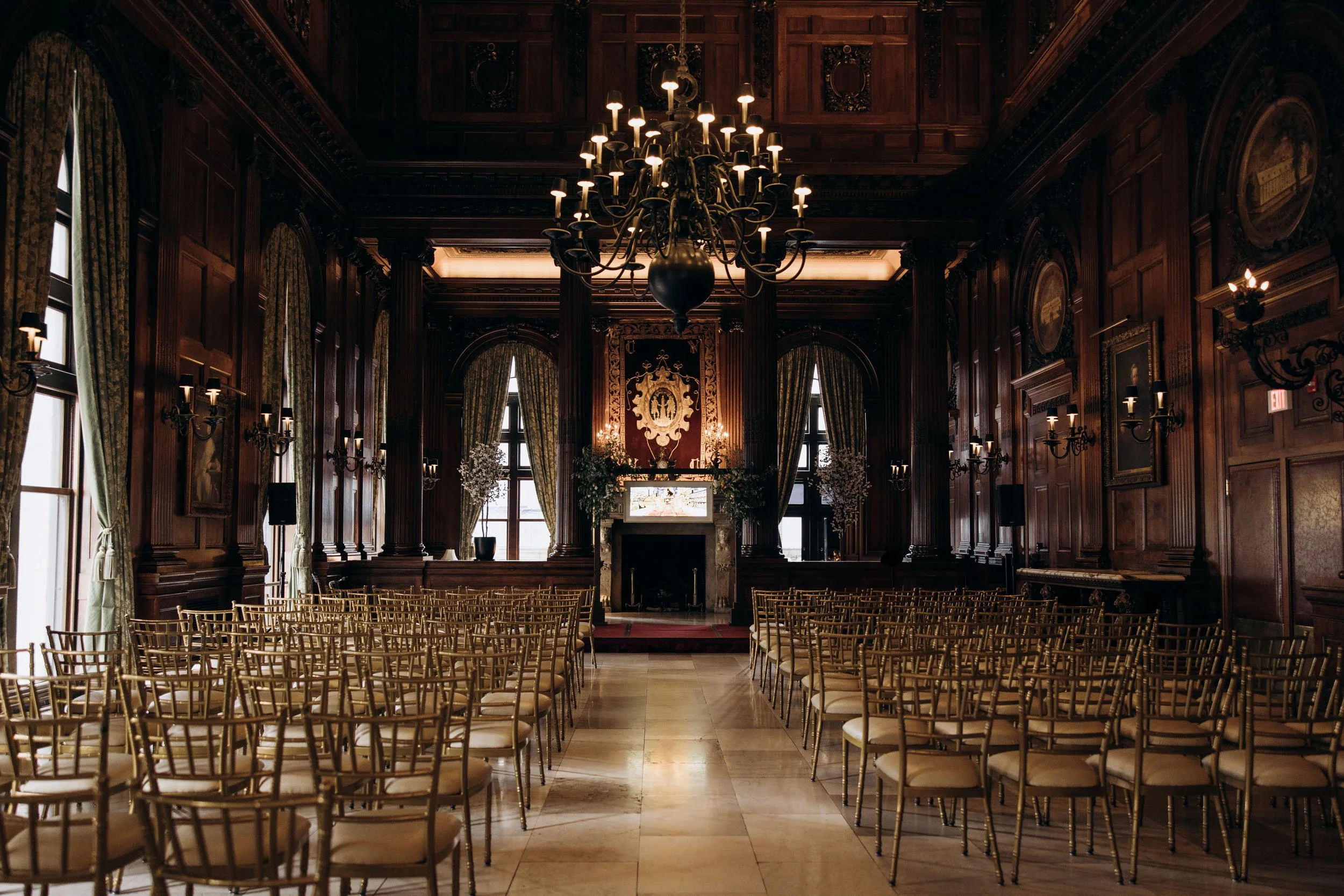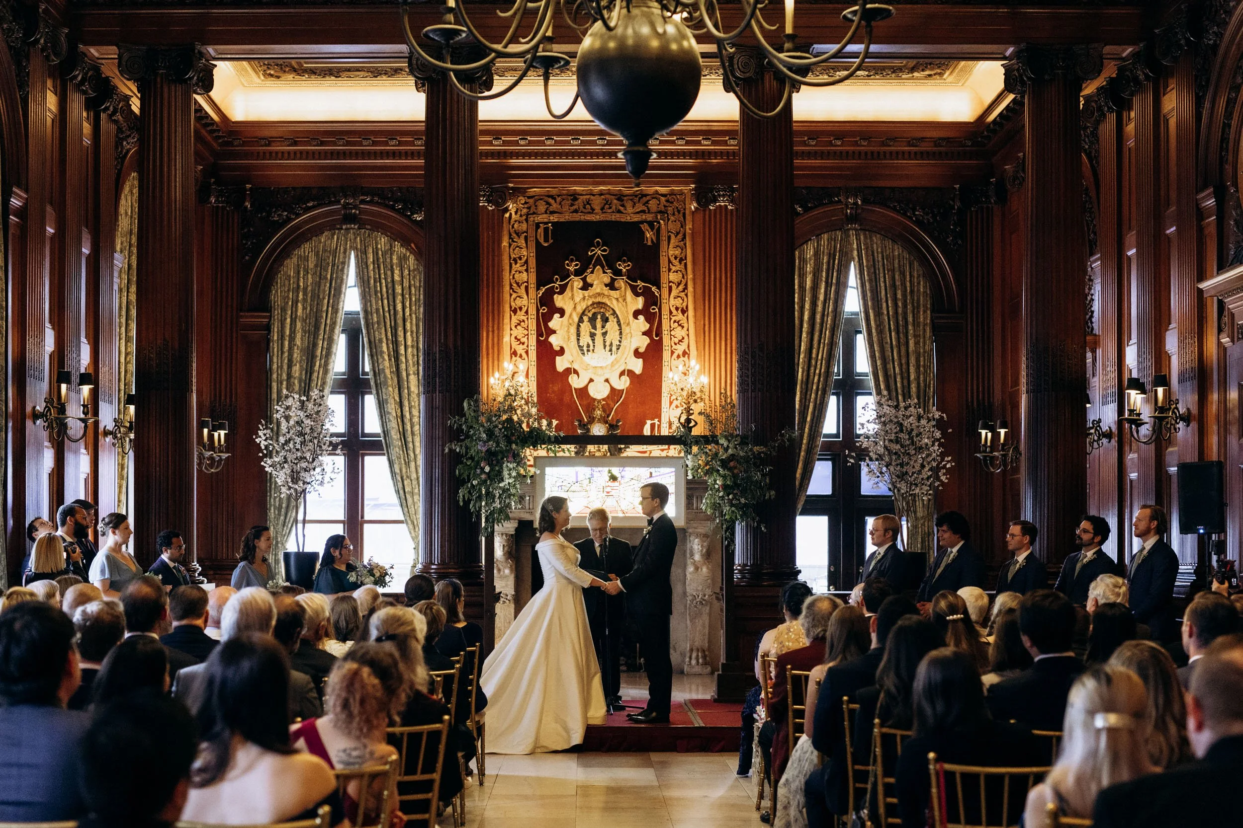 The entire day unfolded inside the New York University Club. The couple got ready in the private rooms upstairs, surrounded by family and the quiet anticipation that builds before a ceremony. The ballroom, with its chandeliers, dark wood paneling, and timeless design, hosted both the ceremony and reception. It’s a venue that feels classic and established without being overdone — elegant in a way that photographs beautifully and naturally lends itself to editorial wedding photos.