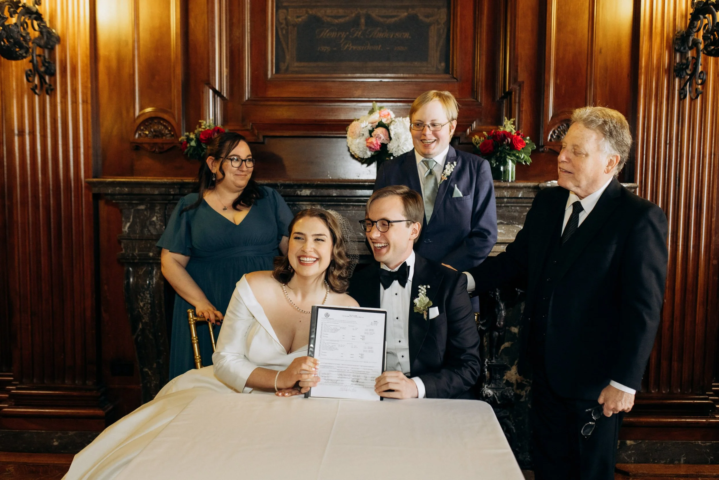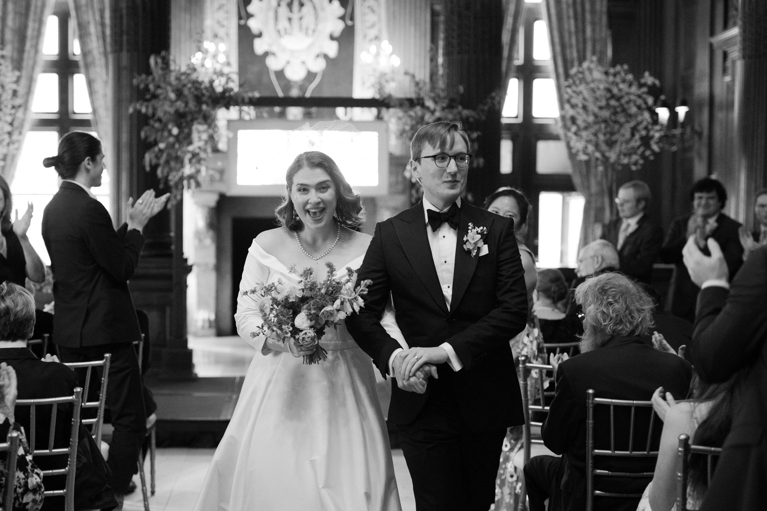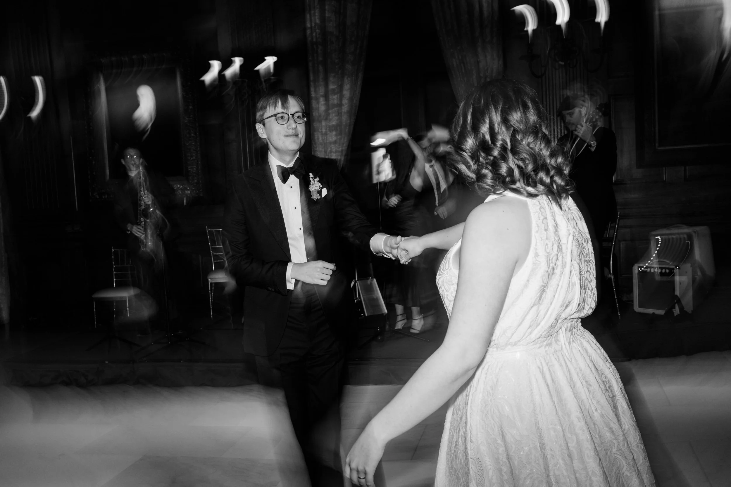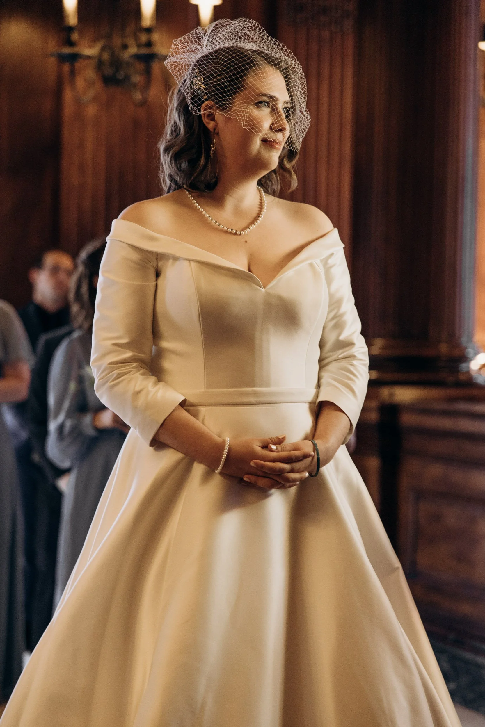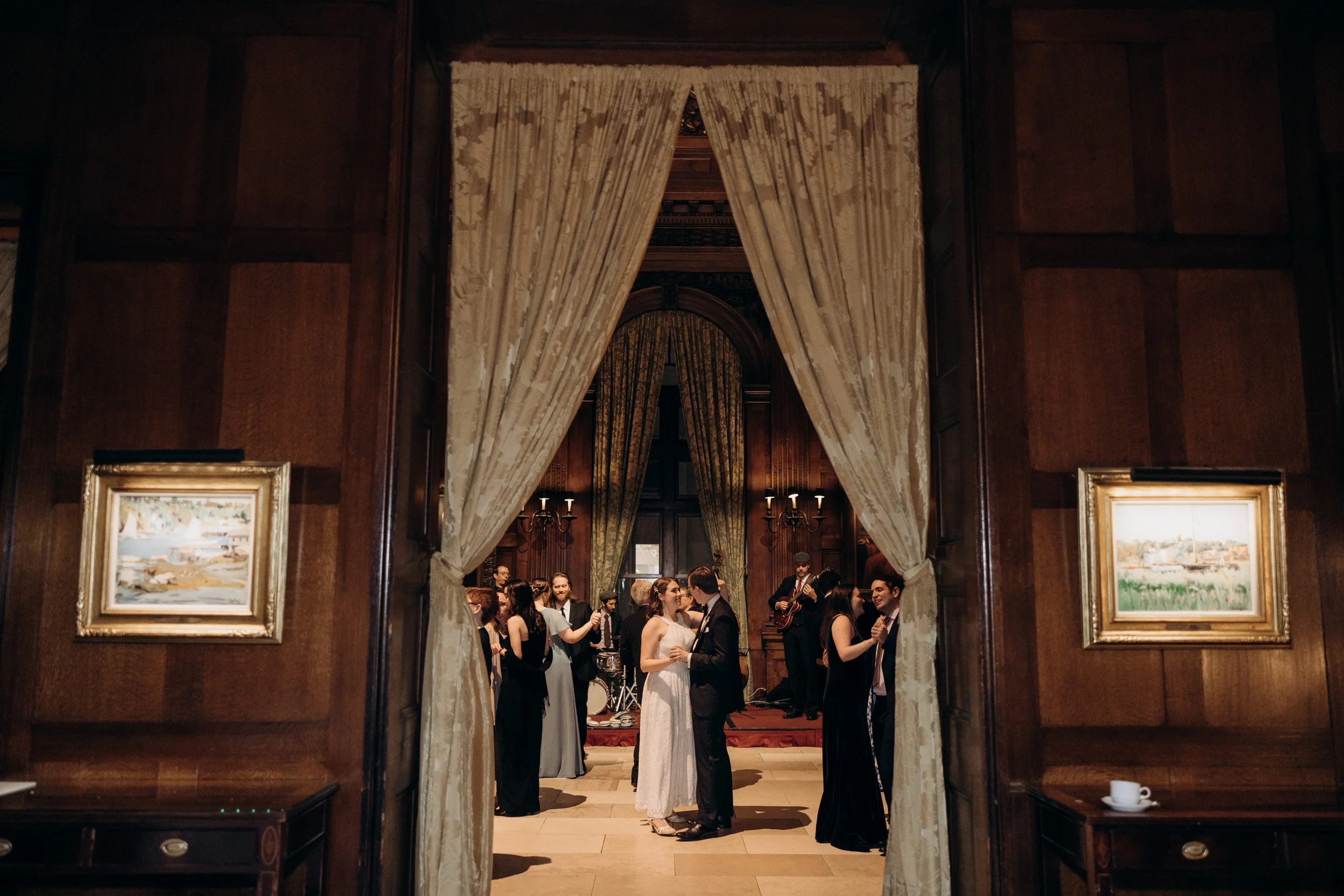 The entire day unfolded inside the New York University Club. The couple got ready in the private rooms upstairs, surrounded by family and the quiet anticipation that builds before a ceremony. The ballroom, with its chandeliers, dark wood paneling, and timeless design, hosted both the ceremony and reception. It’s a venue that feels classic and established without being overdone — elegant in a way that photographs beautifully and naturally lends itself to editorial wedding photos.
