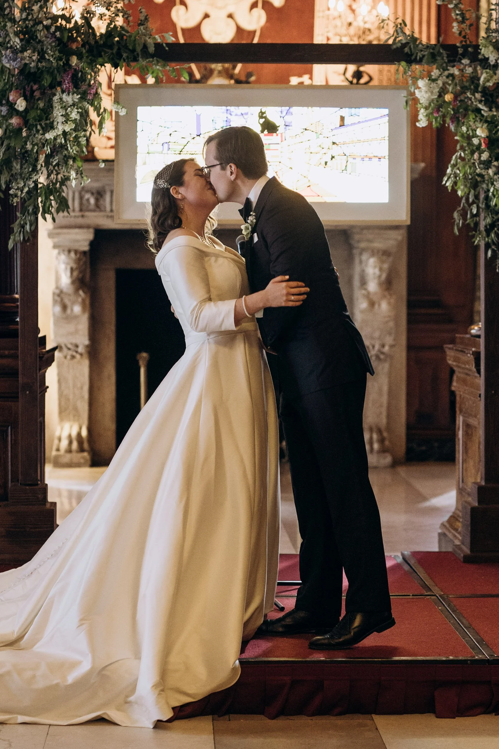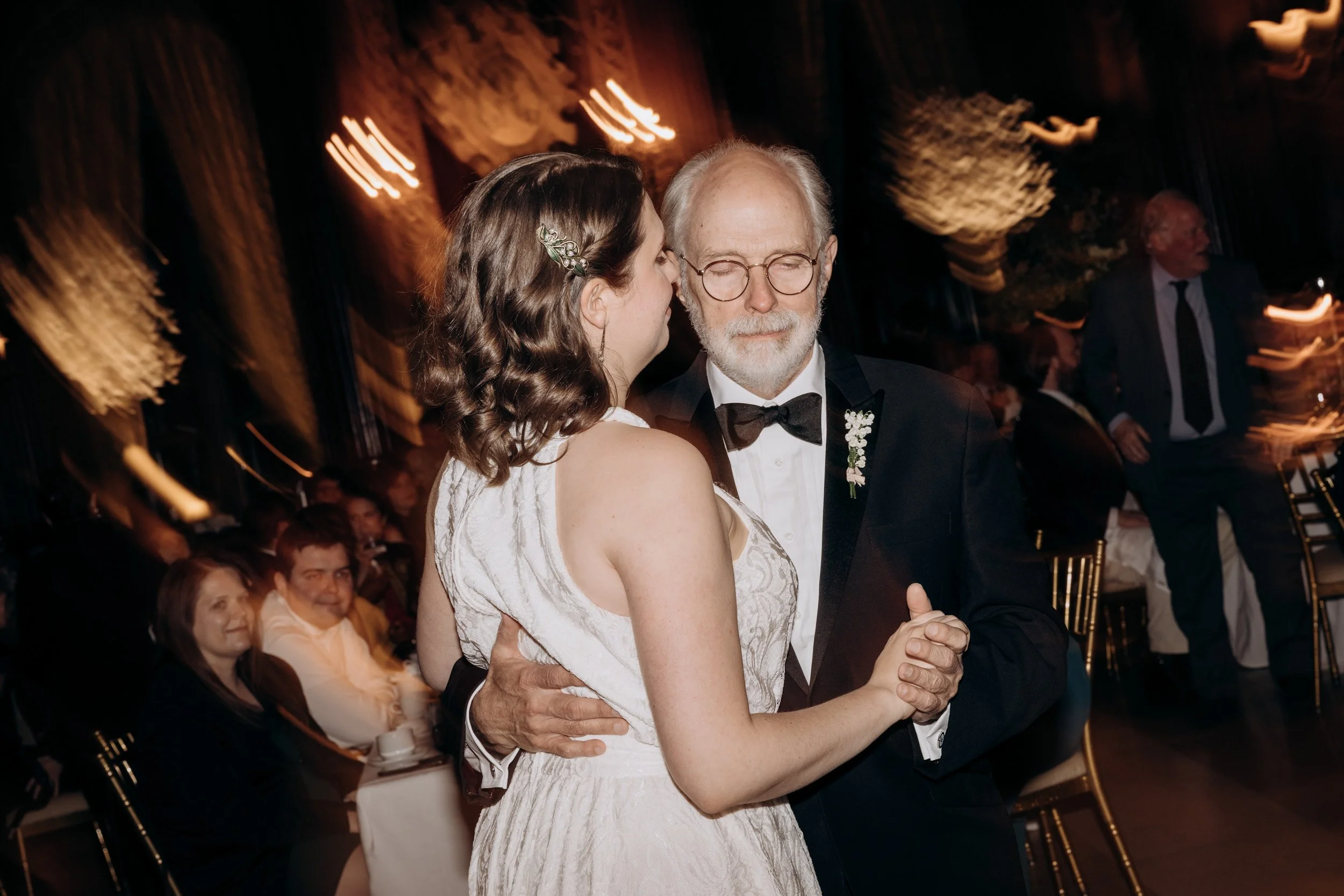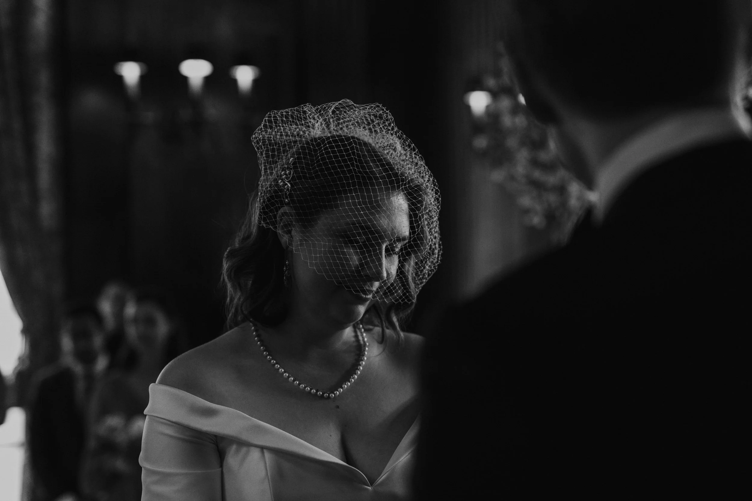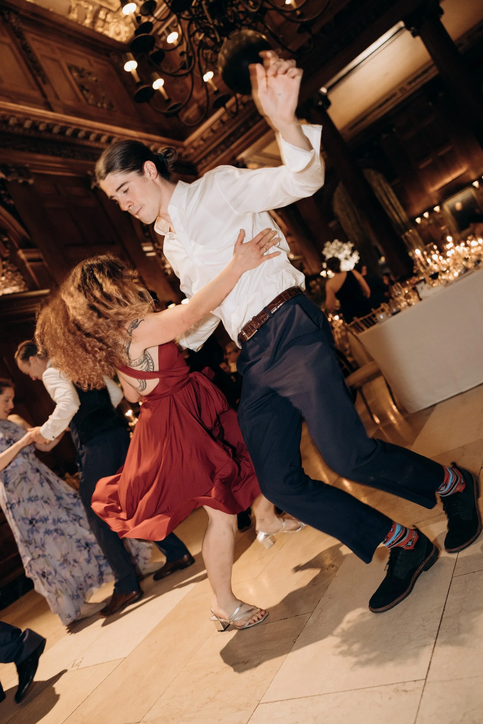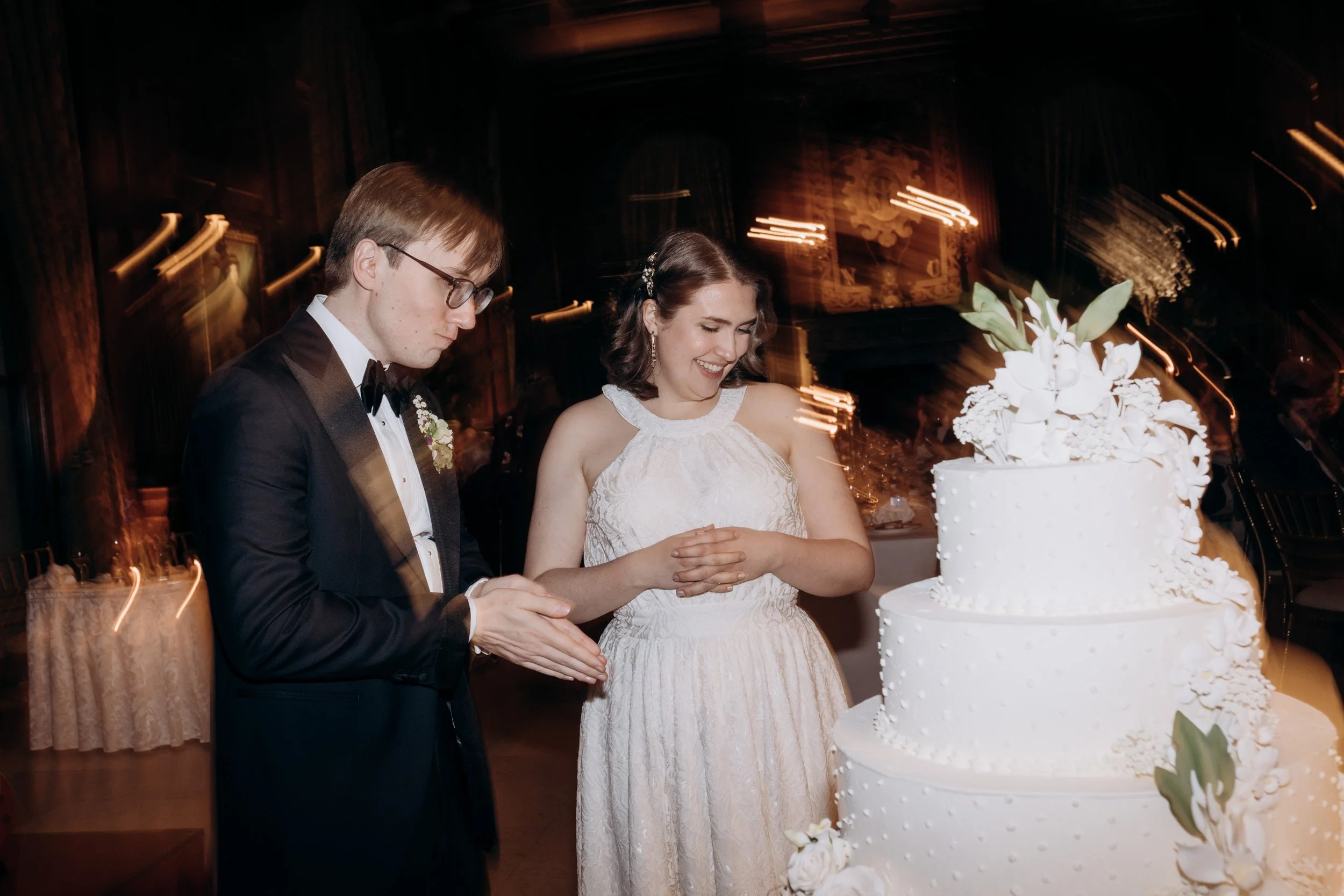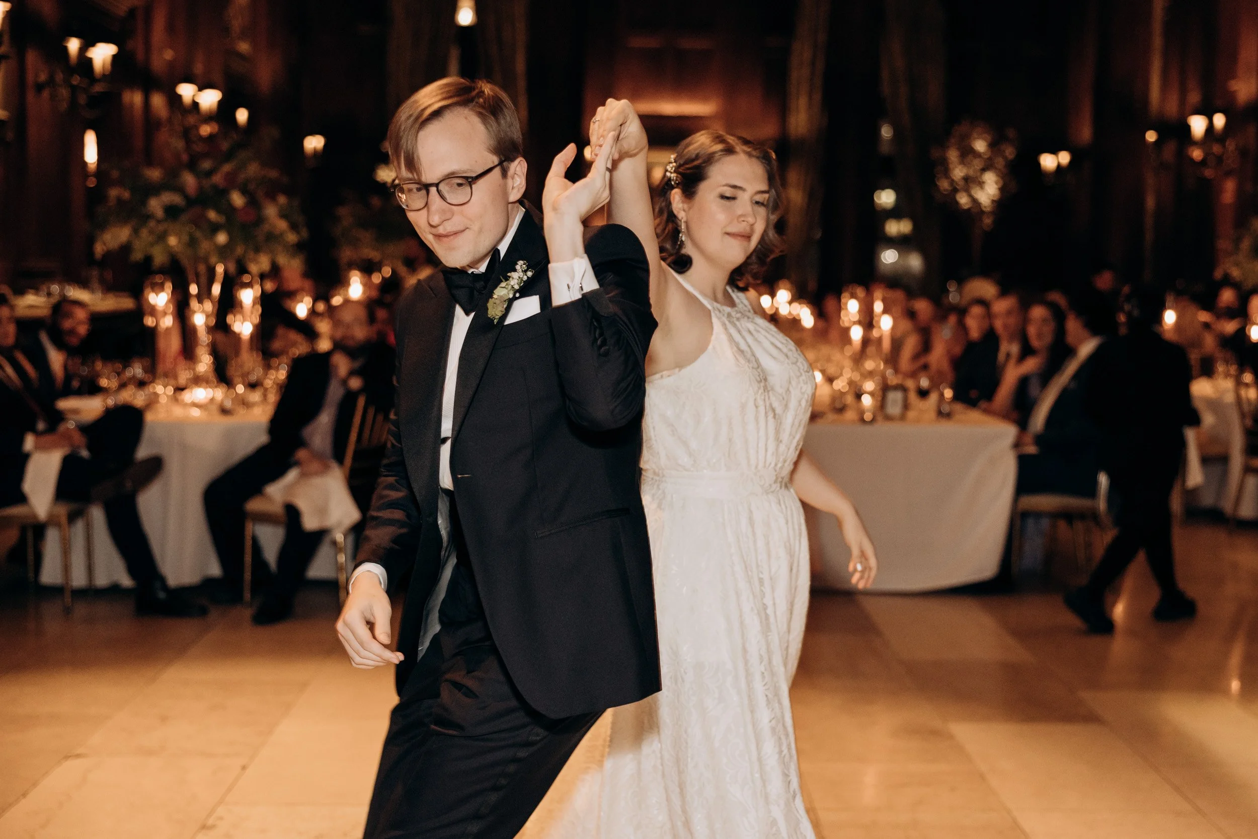 The entire day unfolded inside the New York University Club. The couple got ready in the private rooms upstairs, surrounded by family and the quiet anticipation that builds before a ceremony. The ballroom, with its chandeliers, dark wood paneling, and timeless design, hosted both the ceremony and reception. It’s a venue that feels classic and established without being overdone — elegant in a way that photographs beautifully and naturally lends itself to editorial wedding photos.