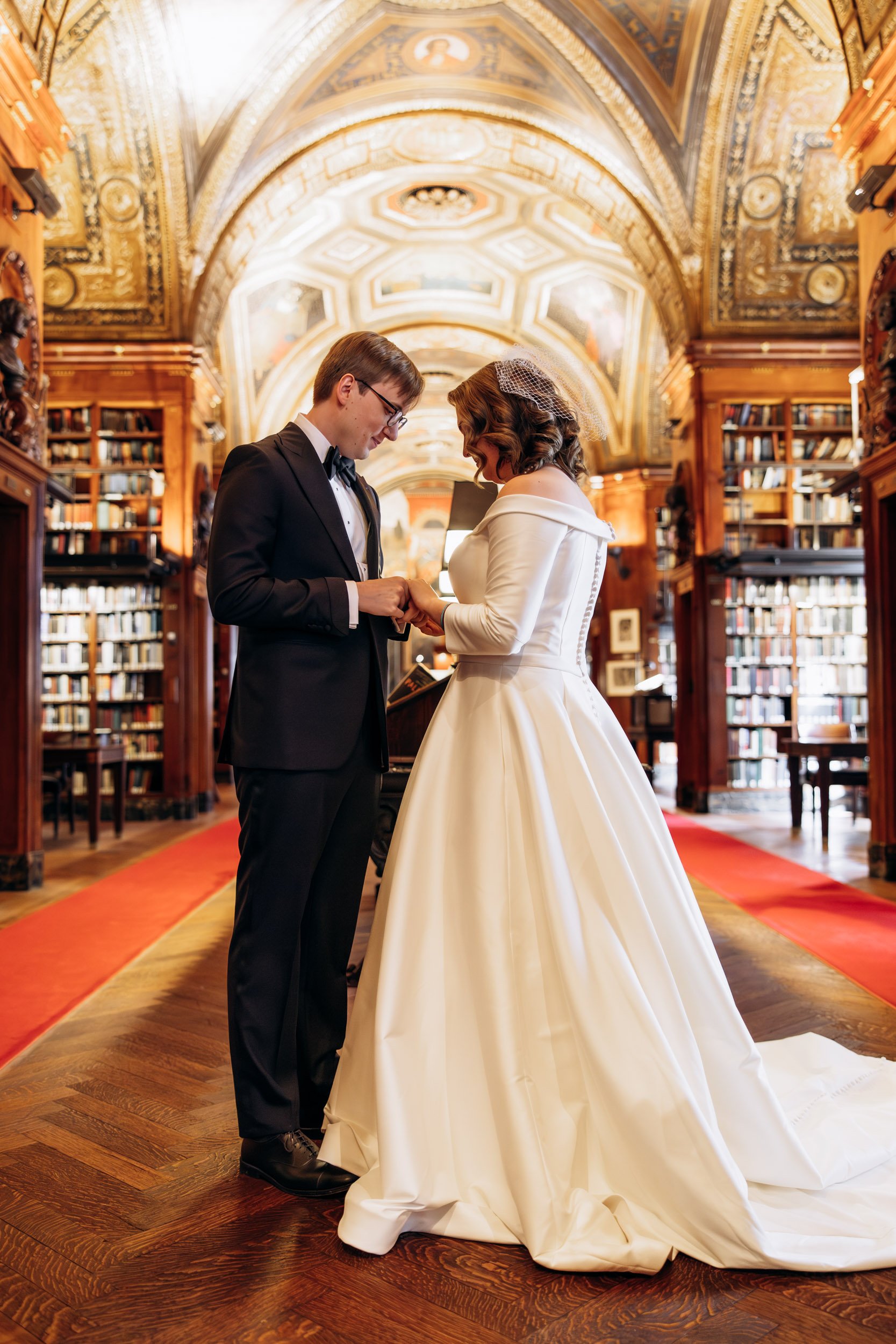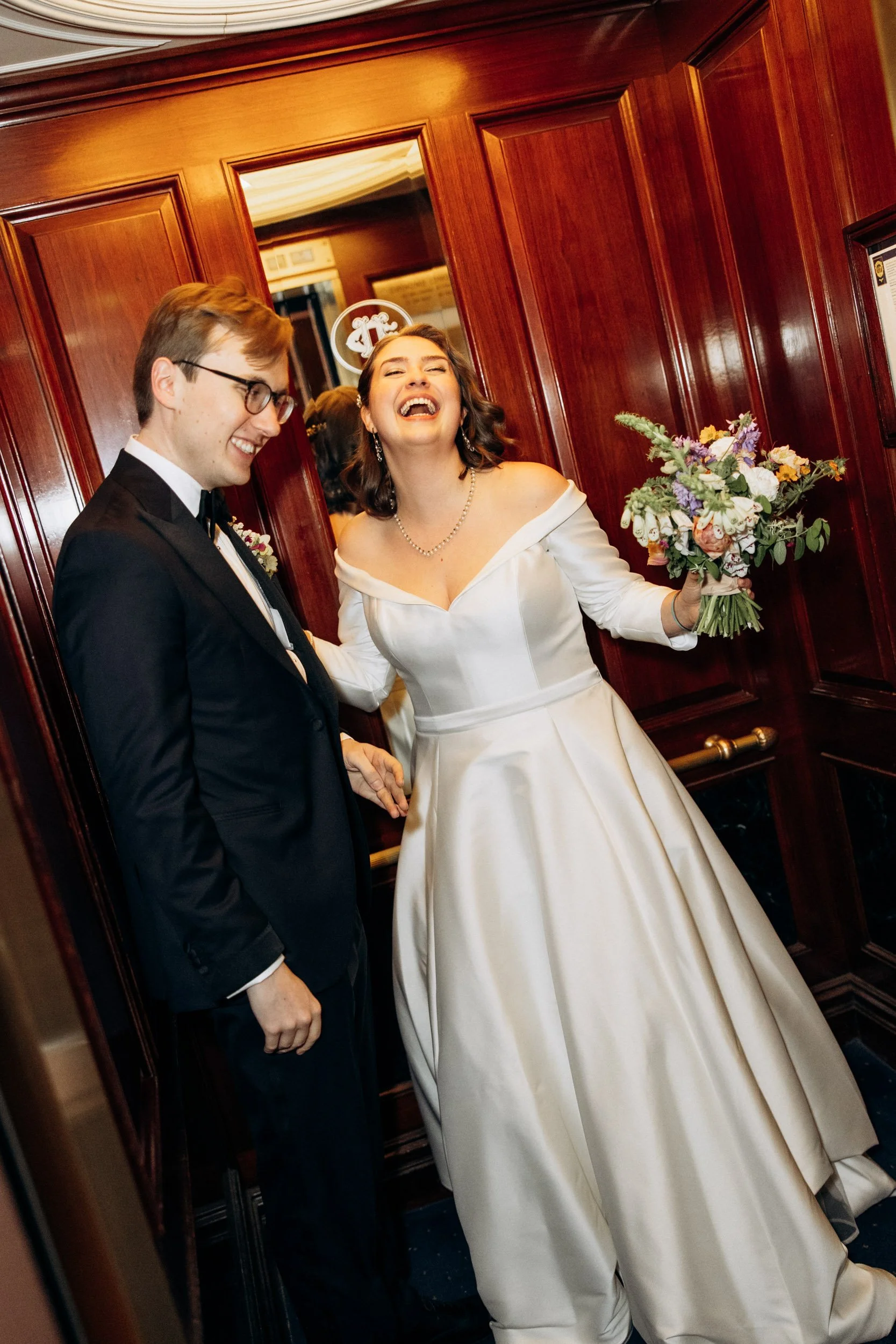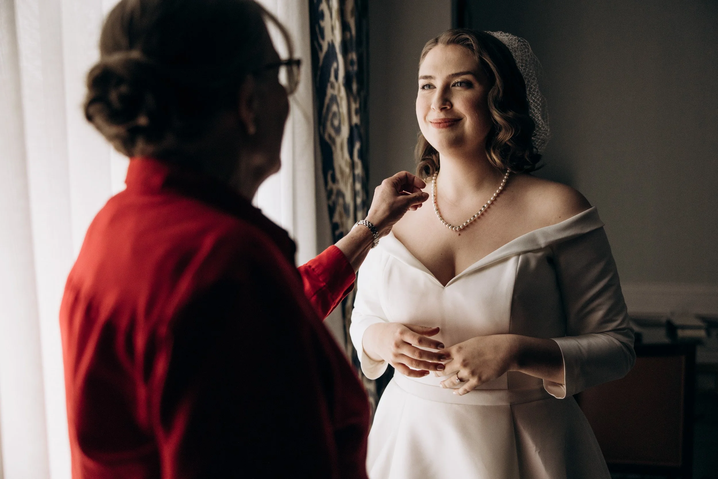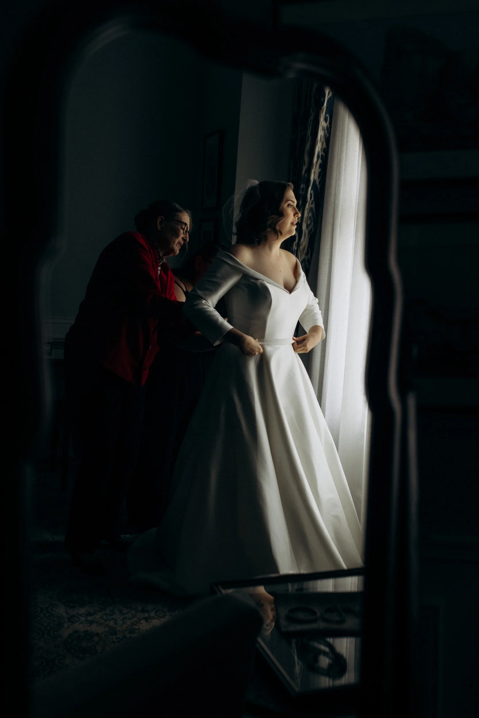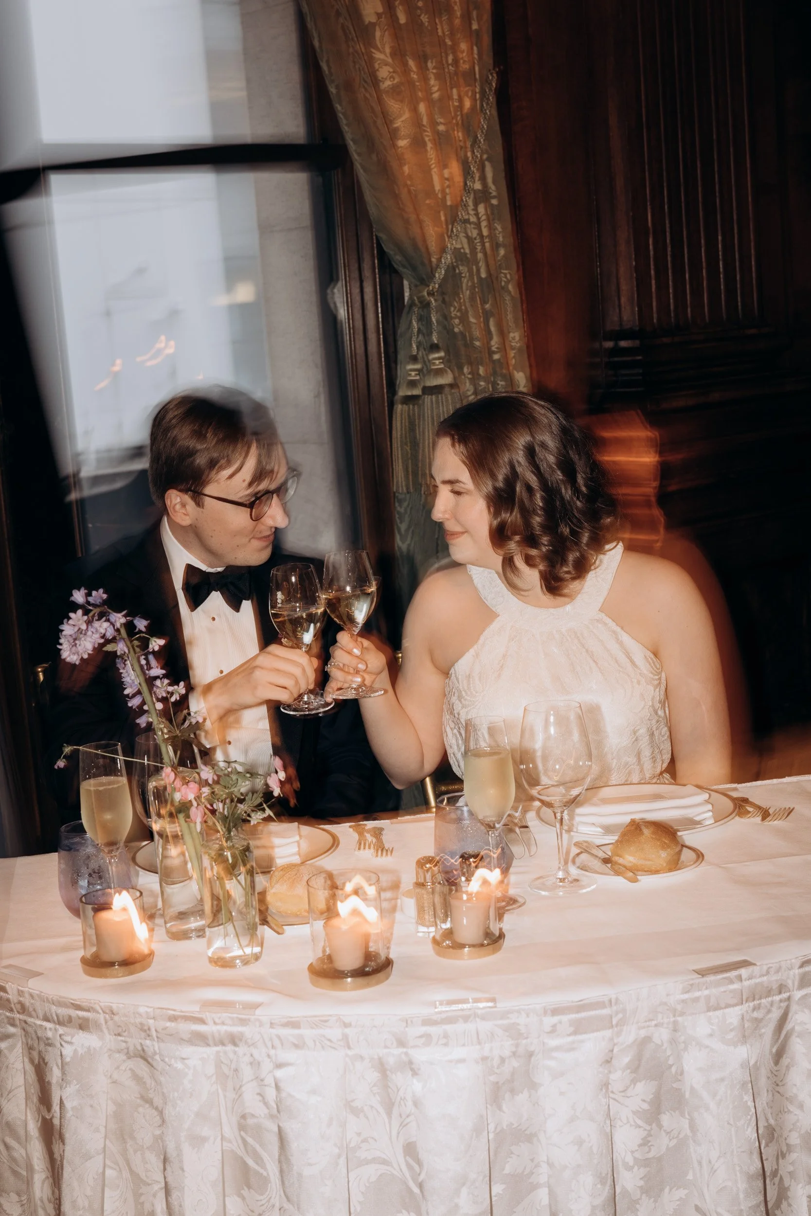 The entire day unfolded inside the New York University Club. The couple got ready in the private rooms upstairs, surrounded by family and the quiet anticipation that builds before a ceremony. The ballroom, with its chandeliers, dark wood paneling, and timeless design, hosted both the ceremony and reception. It’s a venue that feels classic and established without being overdone — elegant in a way that photographs beautifully and naturally lends itself to editorial wedding photos.