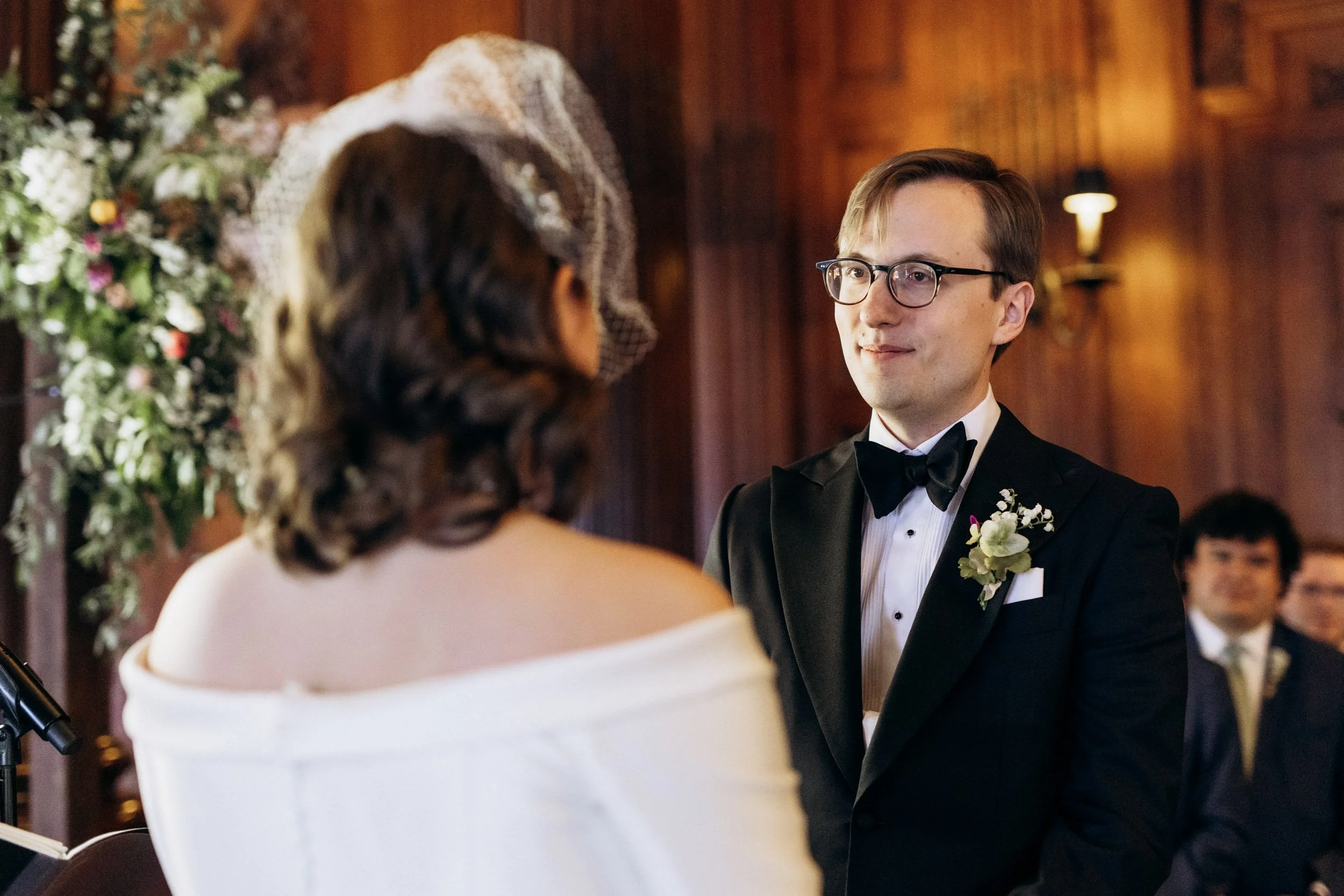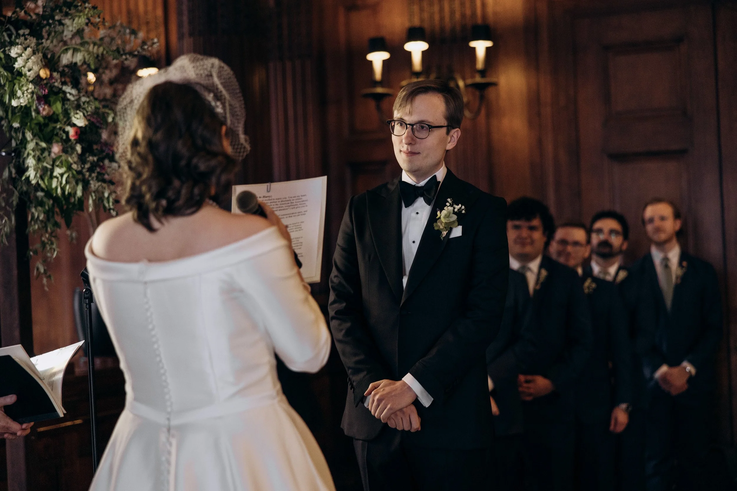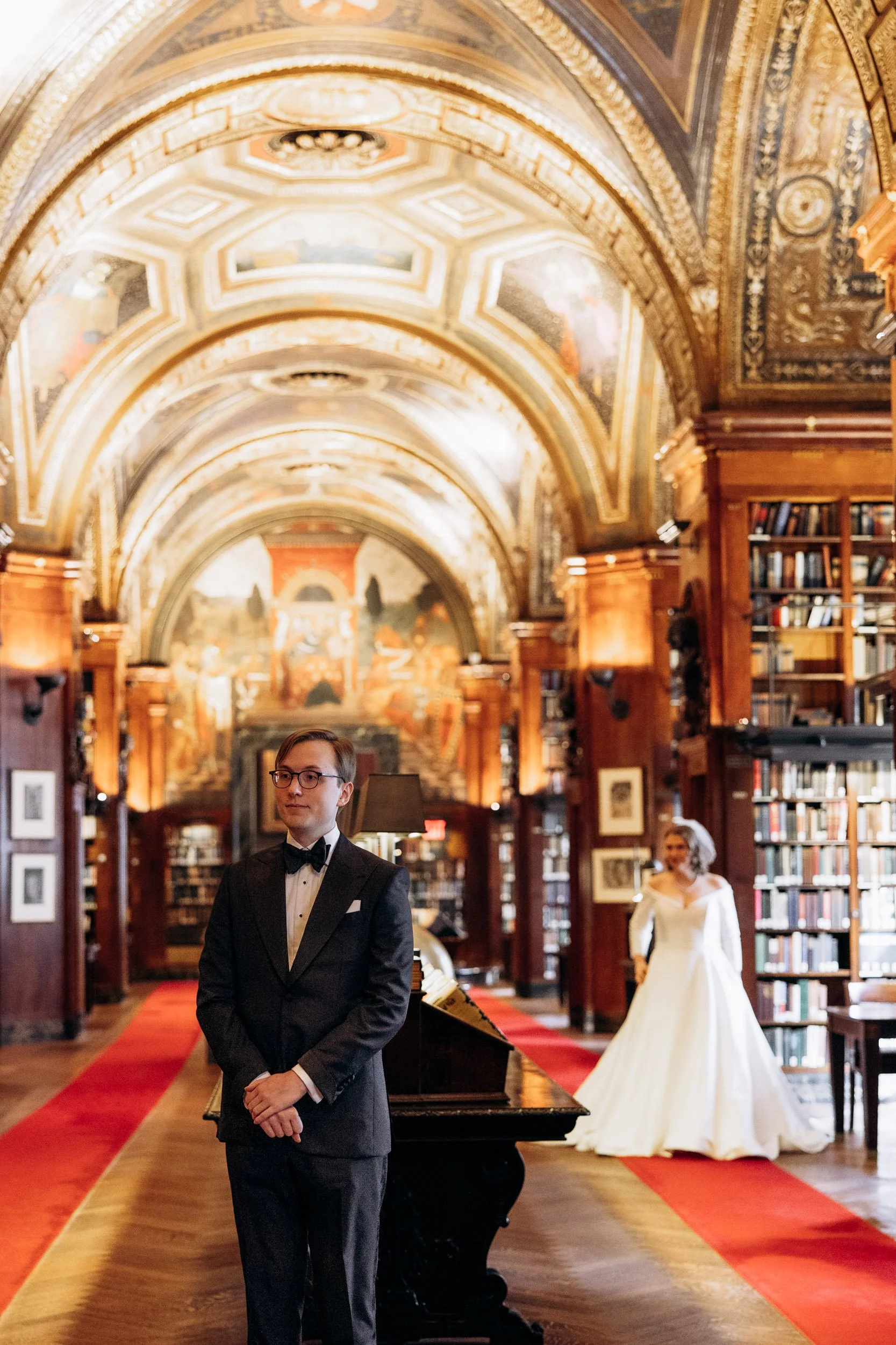 Before the ceremony, we created a dreamlike first look inside one of the Club’s library spaces. The tall bookshelves, warm tones, and soft window light gave the moment a cinematic quality. It felt intimate and still — almost suspended in time — a sharp contrast to the movement of Manhattan just outside. As an editorial wedding photographer, these environments are a gift. The clean compositions, layered textures, and controlled light allow us to create images that feel refined while remaining emotionally real.