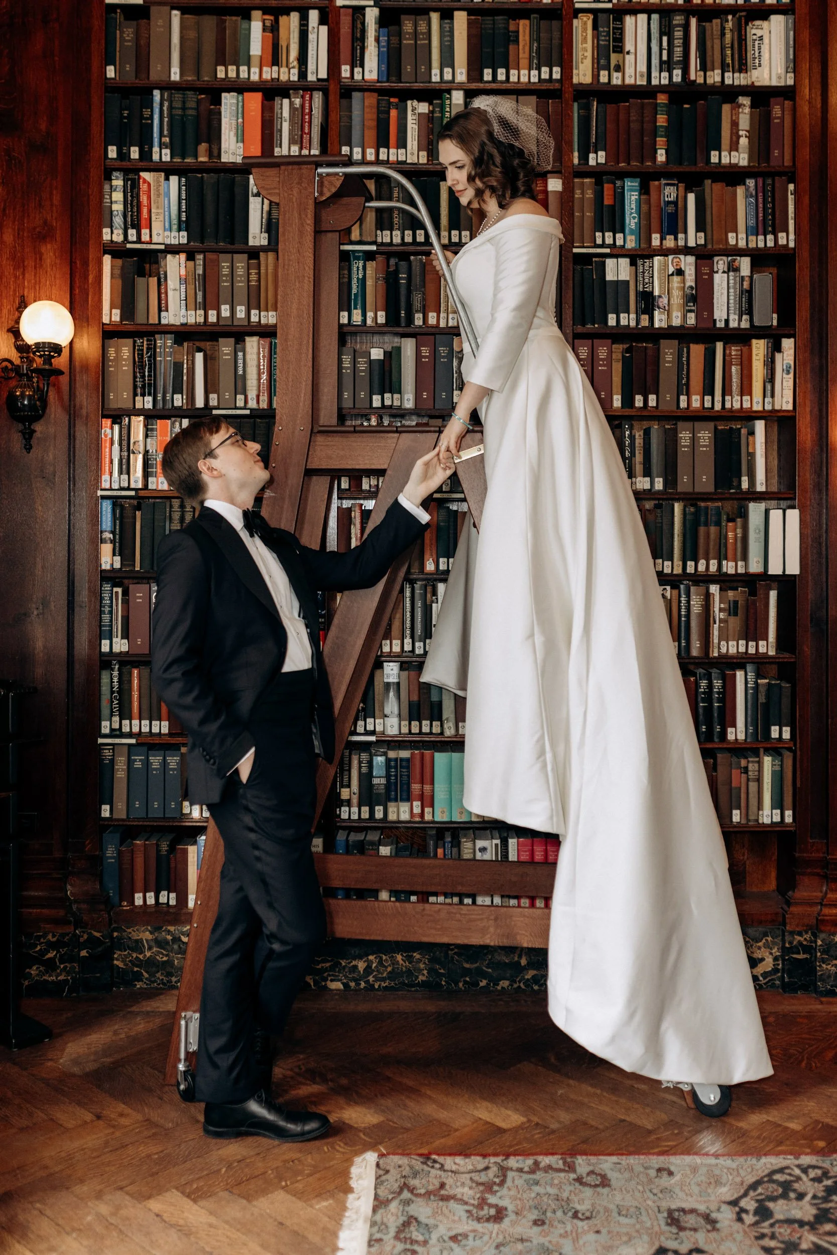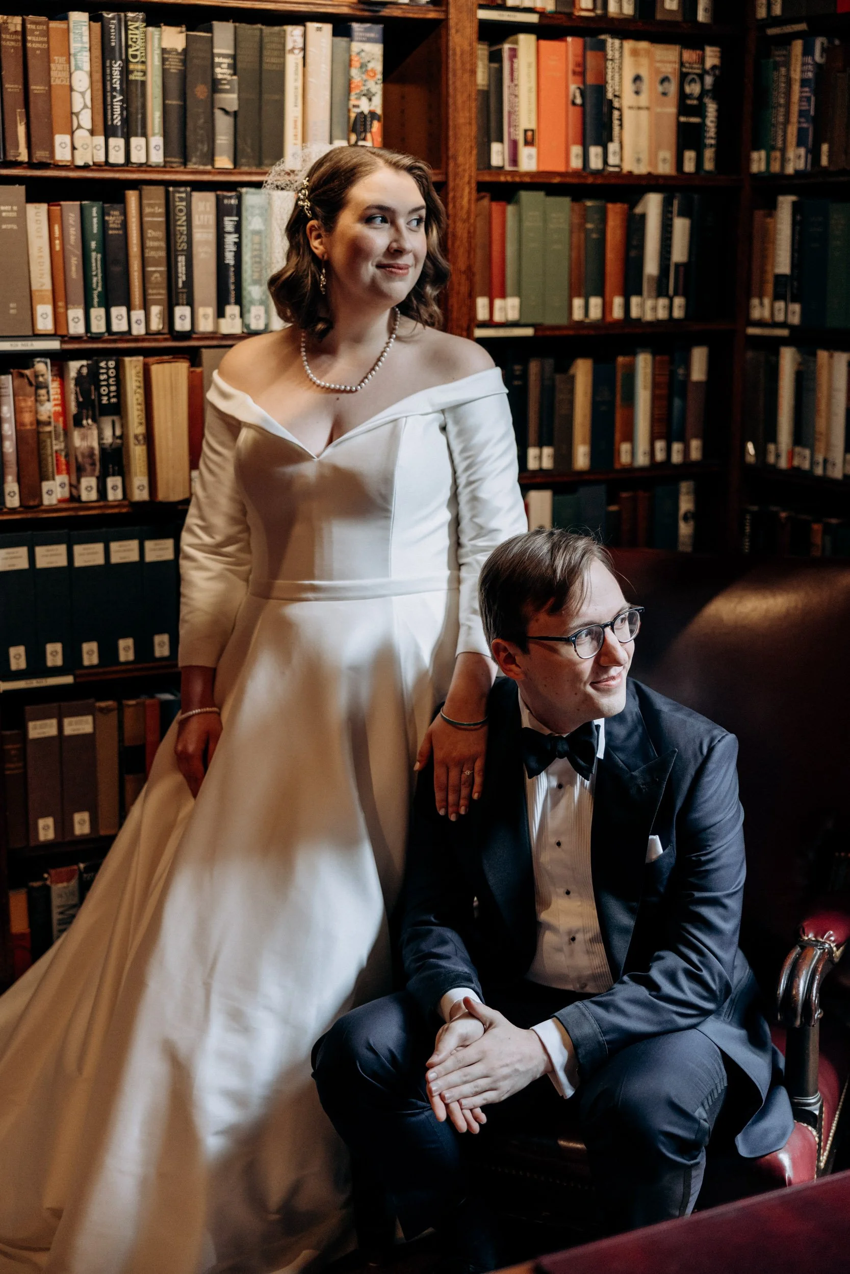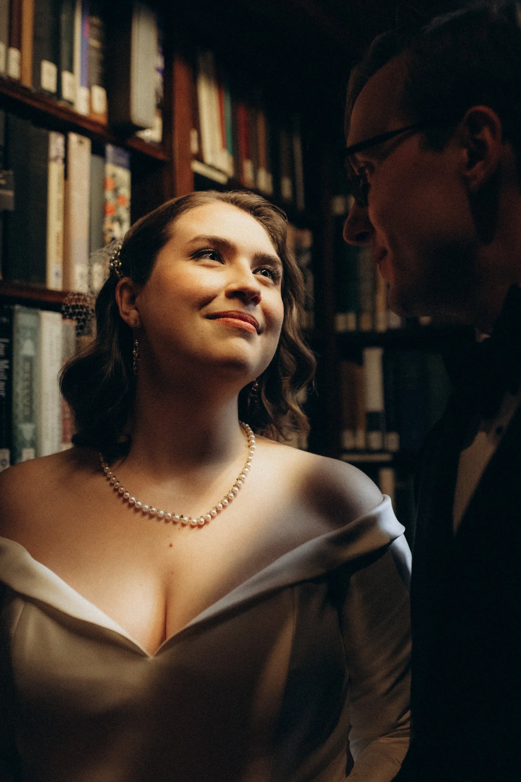 Before the ceremony, we created a dreamlike first look inside one of the Club’s library spaces. The tall bookshelves, warm tones, and soft window light gave the moment a cinematic quality. It felt intimate and still — almost suspended in time — a sharp contrast to the movement of Manhattan just outside. As an editorial wedding photographer, these environments are a gift. The clean compositions, layered textures, and controlled light allow us to create images that feel refined while remaining emotionally real.