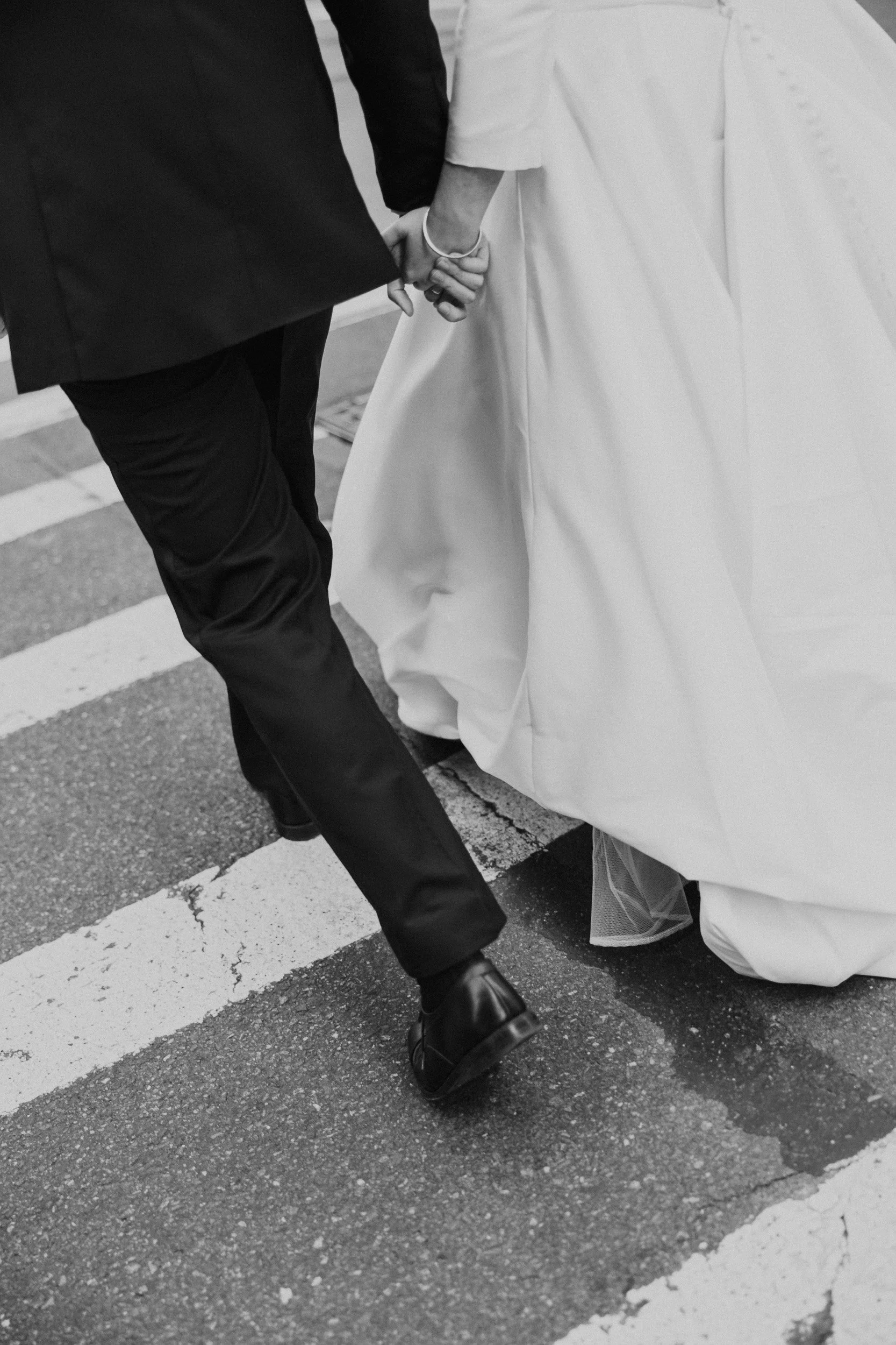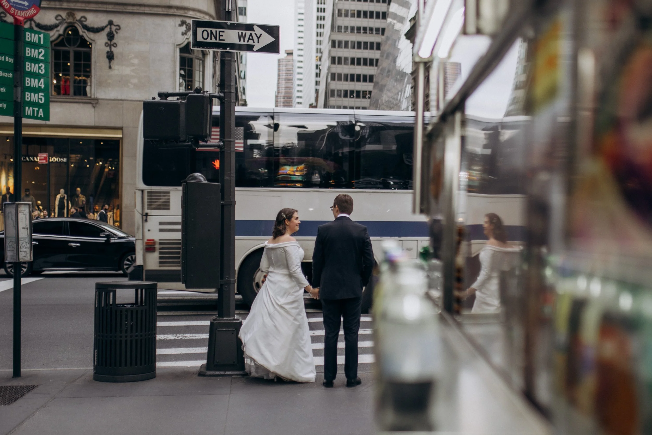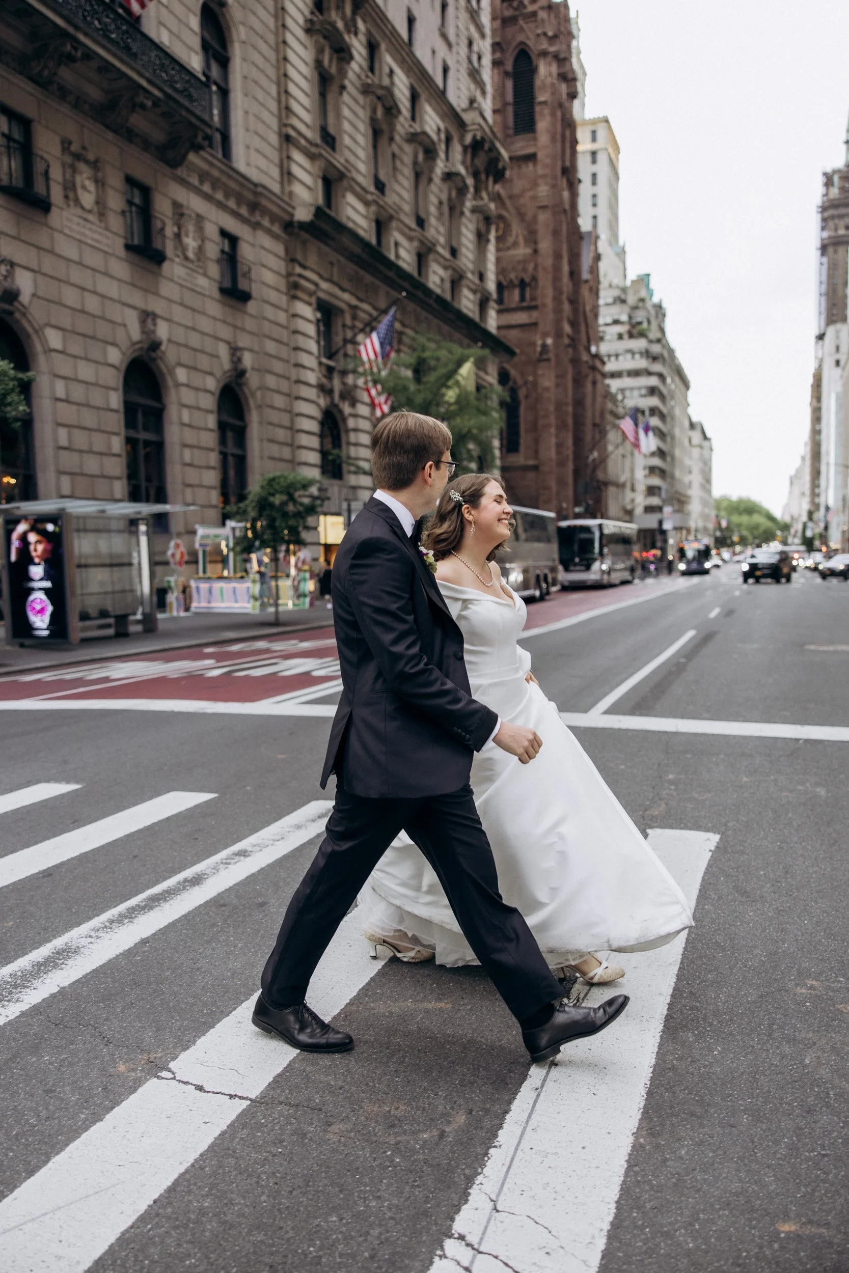 Afterward, we stepped out onto 5th Avenue for portraits — one of the most iconic stretches in New York City. Photographing a couple right in the rhythm of Manhattan requires a balance of direction and spontaneity. Yellow taxis rolled by, pedestrians moved naturally through the frame, and yet the couple remained completely present with each other. The result was a series of editorial wedding photos that feel candid but intentional — modern, stylish, and unmistakably New York. For couples planning a spring or summer wedding in Manhattan, incorporating the city itself adds an energy that simply can’t be replicated elsewhere.